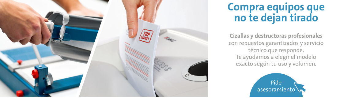 Ofrecemos una amplia variedad de modelos de cizallas Dahle: cizallas de rodillo y de palanca, guillotinas para taller e industria, cizallas con cuchilla especial para cortar una amplia gama de materiales, así como recambios y accesorios originales para mantener su equipo siempre en perfecto estado. También ponemos a su disposición una completa selección de destructoras Dahle, diseñadas para garantizar la destrucción segura y fiable de papel y documentos sensibles.